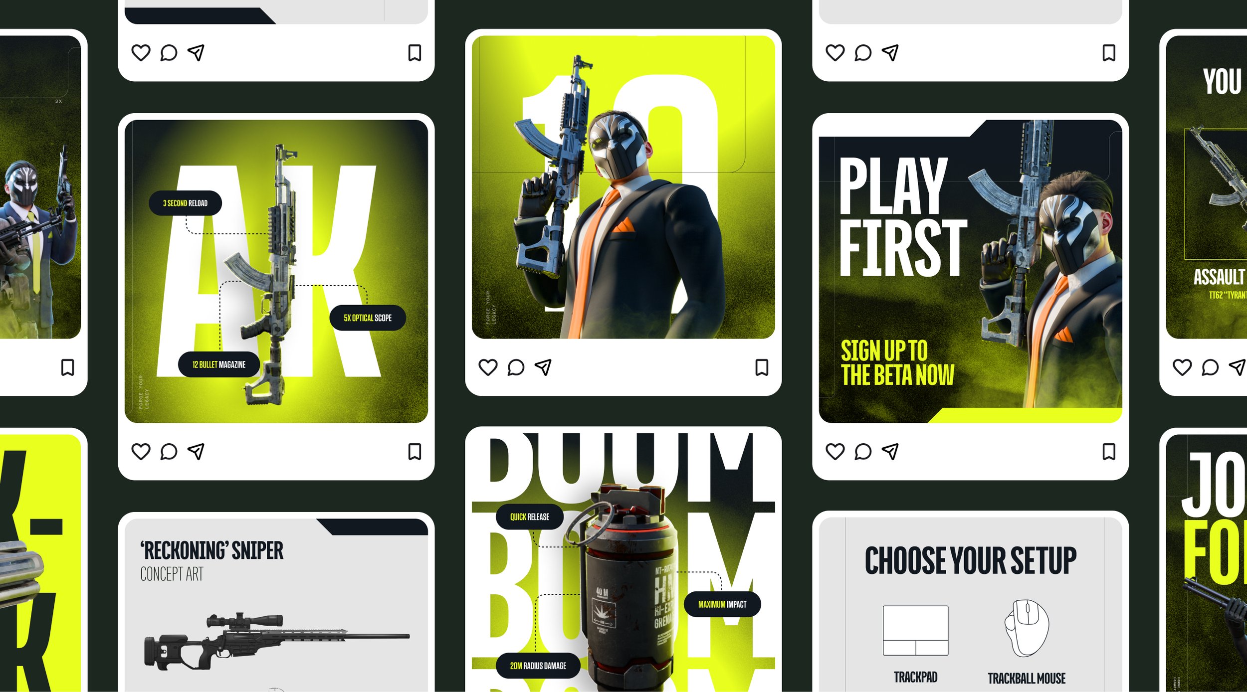 Over the course of the next few months, various brand assets were created - including all of the Steam marketplace imagery, box art, OOH, promo ads, merchandise and an array of social posts targeted at driving hype around the game.