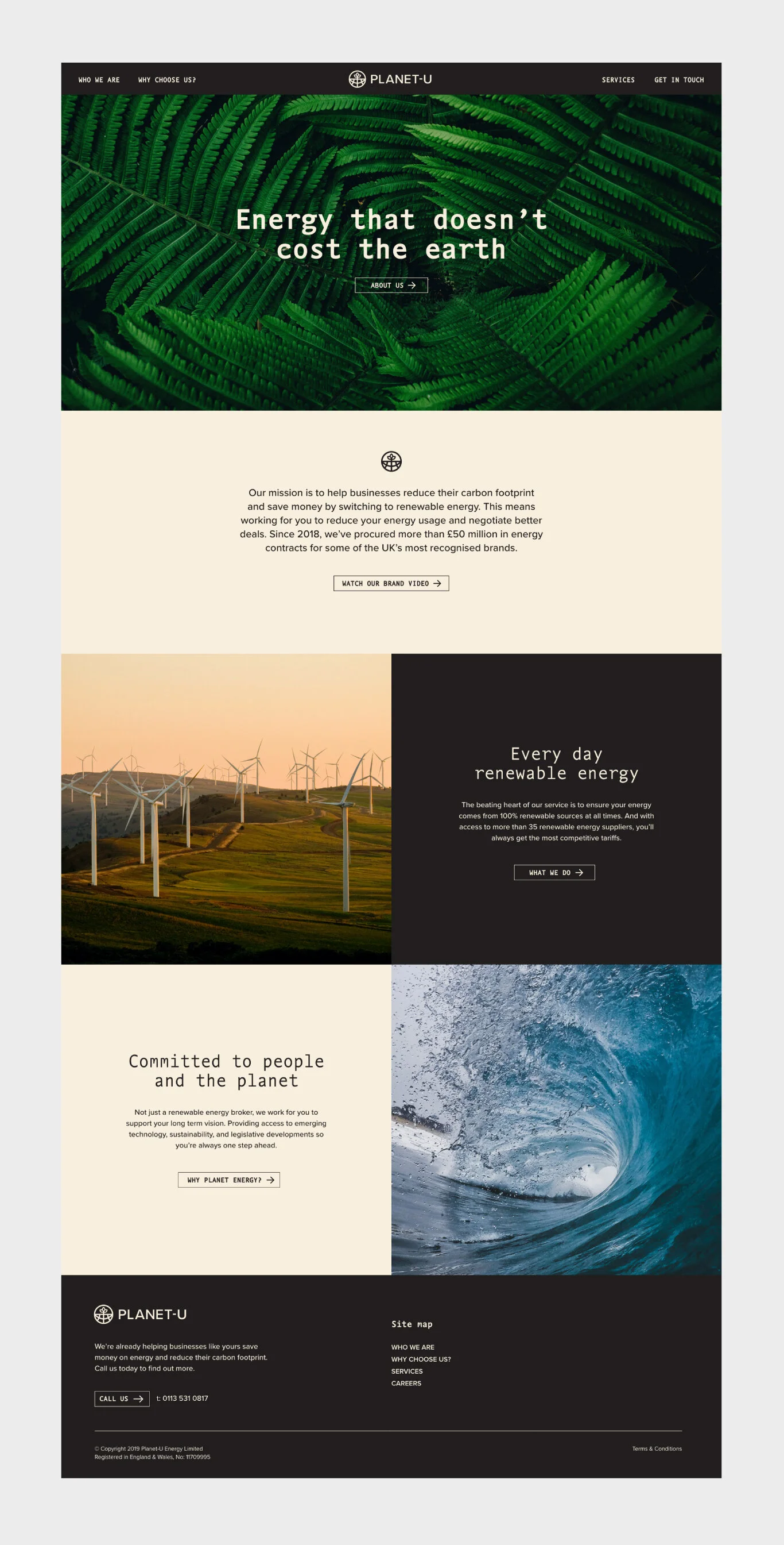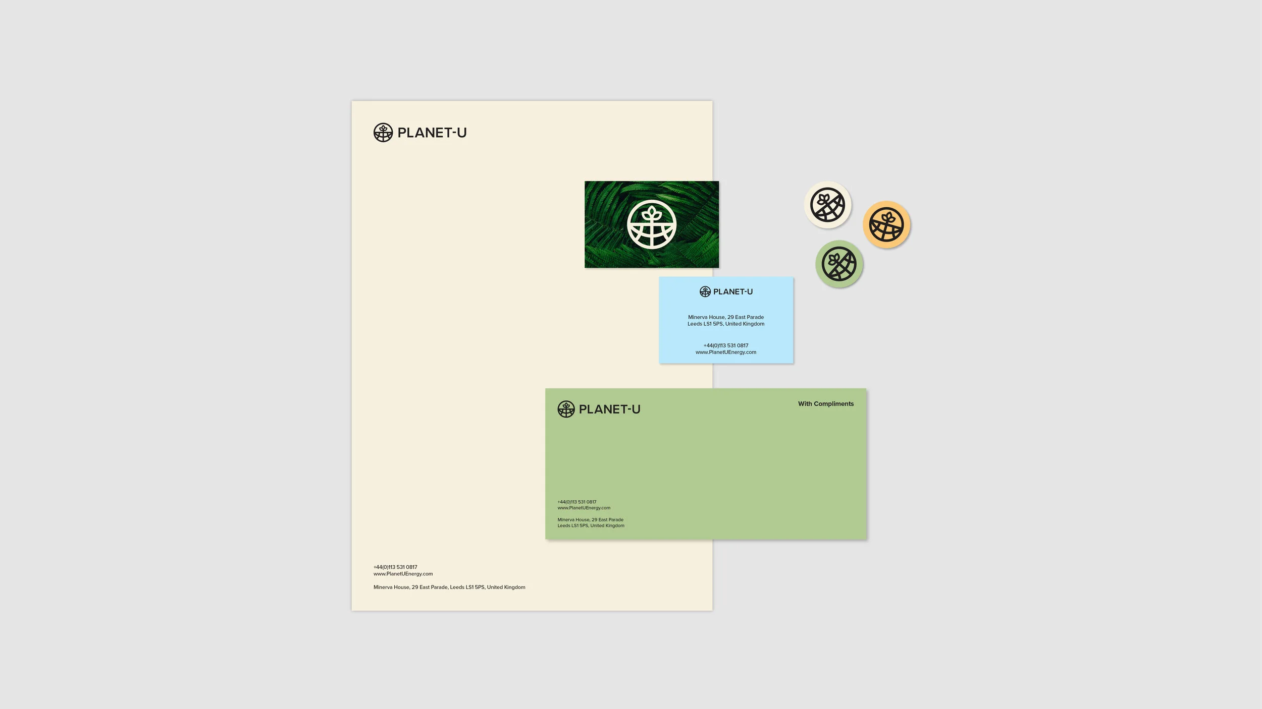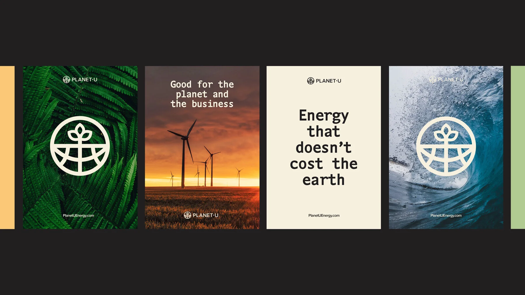 A symmetrical brand mark, comprised of a globe shape and a growing plant, illustrates Planet-U’s commitment to renewable energy and care for the planet.