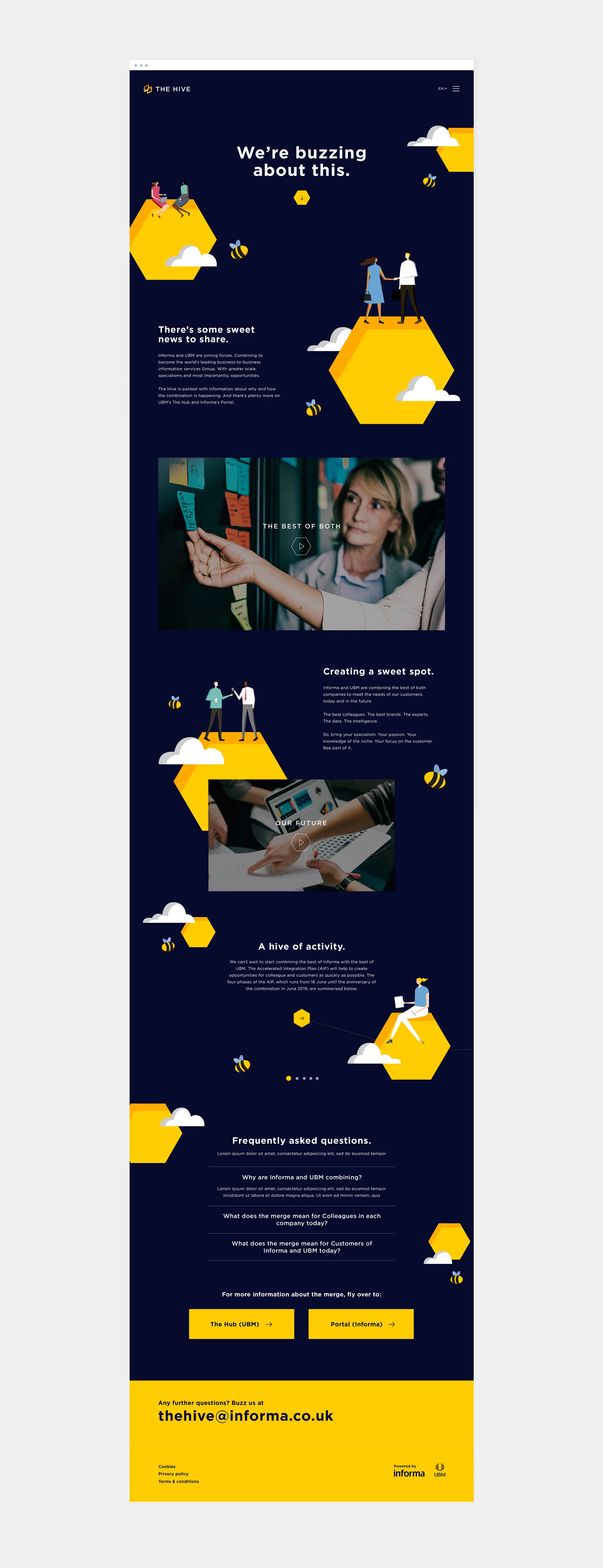 This project was to support the merger of Informa and UBM - two rapidly evolving and expanding multi-national companies. The key aim was to create a system that would provide information, support and guidance to staff through every step of the journey. This led to the design and creation of a new sub-brand and microsite known as The Hive.